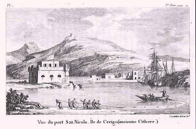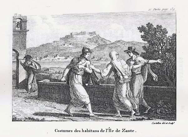 * Γκραβούρες του Antoine Laurent Castellan (1772-1838), από το βιβλίο του Lettres sur la Morée et les iles Cérigo, Hydra et Zante (vols. 1 et 2). Paris, chez H. Agasse, 1808. Ο Castellan, (γάλλος ζωγράφος, αρχιτέκτονας, χαράκτης, συγγραφέας και μέλος της Γαλλικής Ακαδημίας Τεχνών), ταξιδεύοντας από τη Μασσαλία προς την Κωνσταντινούπολη πέρασε τον Ιανουάριο του 1797 από τα Κύθηρα, τη Νεάπολη της Μονεμβασίας, την Ύδρα και το Σούνιο, μέρη τα οποία και περιηγήθηκε. Στην επιστροφή του από την Πόλη σταμάτησε και περιηγήθηκε την Κορώνη, το Ναβαρίνο, τα Φιλιατρά, τη Γαστούνη και τη Ζάκυνθο. Στο δίτομο αυτό βιβλίο του περιγράφει τις εντυπώσεις του και απεικονίζει με χαρακτικά του, πάνω σε δικά του σχέδια, τα αρχαιολογικά, αρχιτεκτονικά και άλλα αξιοθέατα, καθώς και σκηνές από τις τοπικές συνήθειες και την καθημερινή ζωή. Στη Ζάκυνθο έφτασε στις 9 Ιουλίου 1797. Έμεινε μόνο λίγες ημέρες στο νησί, στη διάρκεια των οποίων επισκέπτηκε τις πηγές “κατραμιού” στο Κερί. Από τη Ζάκυνθο μας έδωσε μόνο δύο εικόνες: την Πλατεία Αγίου Μάρκου και τις τοπικές ενδυμασίες με φόντο τον Καστρόλοφο, τις οποίες έχουμε ήδη αναρτήσει σε άλλο post στο παρόν ιστολόγιο.
