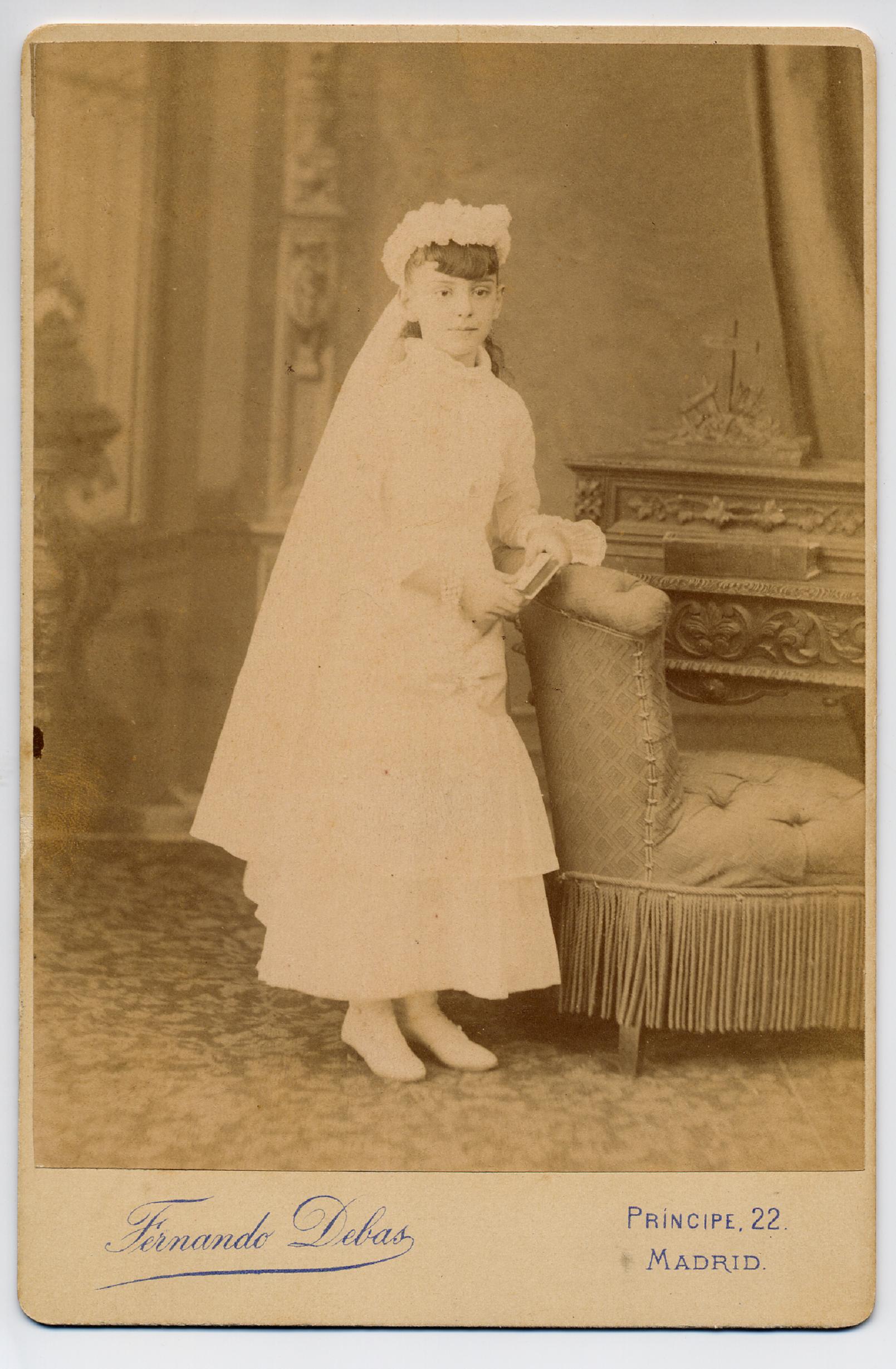 1880. FOTOGRAFOS ESPAÑOLES – Debas, Fernando, Madrid. Niña, retrato de Comunion, Cabinet ca. 1880. Album Sotomayor, Hesperus´ Collection