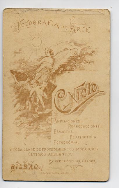 1880s. FOTOGRAFOS ESPAÑOLE$S – Nieto, C., Bilbao. Reverso de CDV, 1880s. Album Sotomayor, Hesperus´ Collection