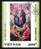 el-greco-en-la-filatelia-vietnam-circa-1992-sello-impreso-por-viet-nam-muestra-virgen-y-el-nino-con-los-santos-ines-y-tecla