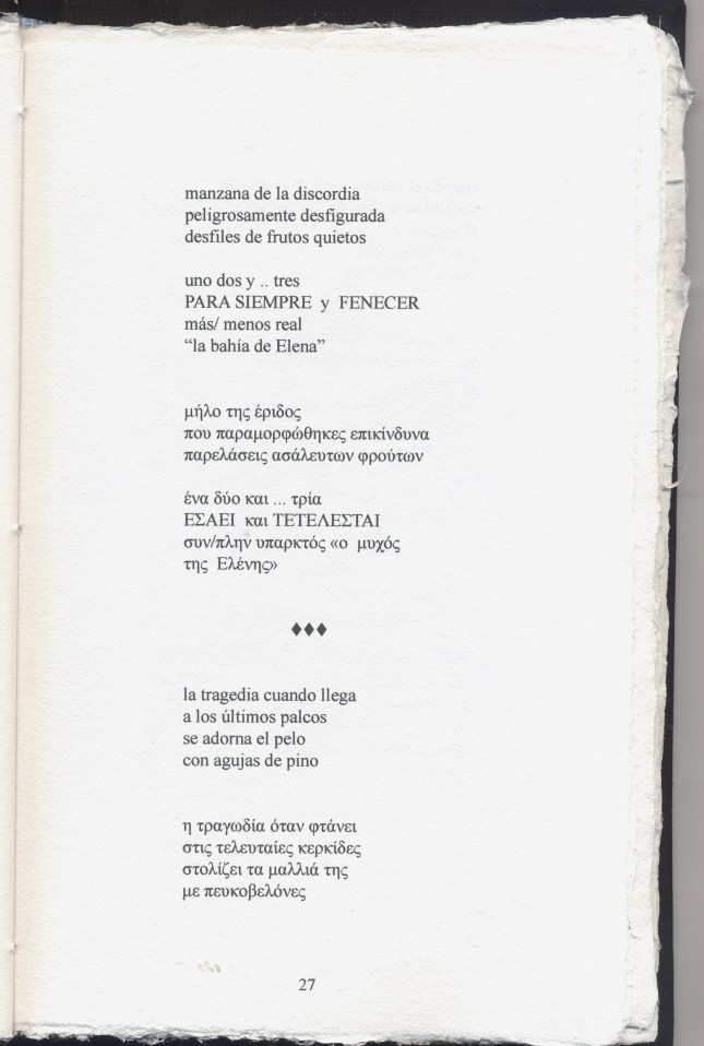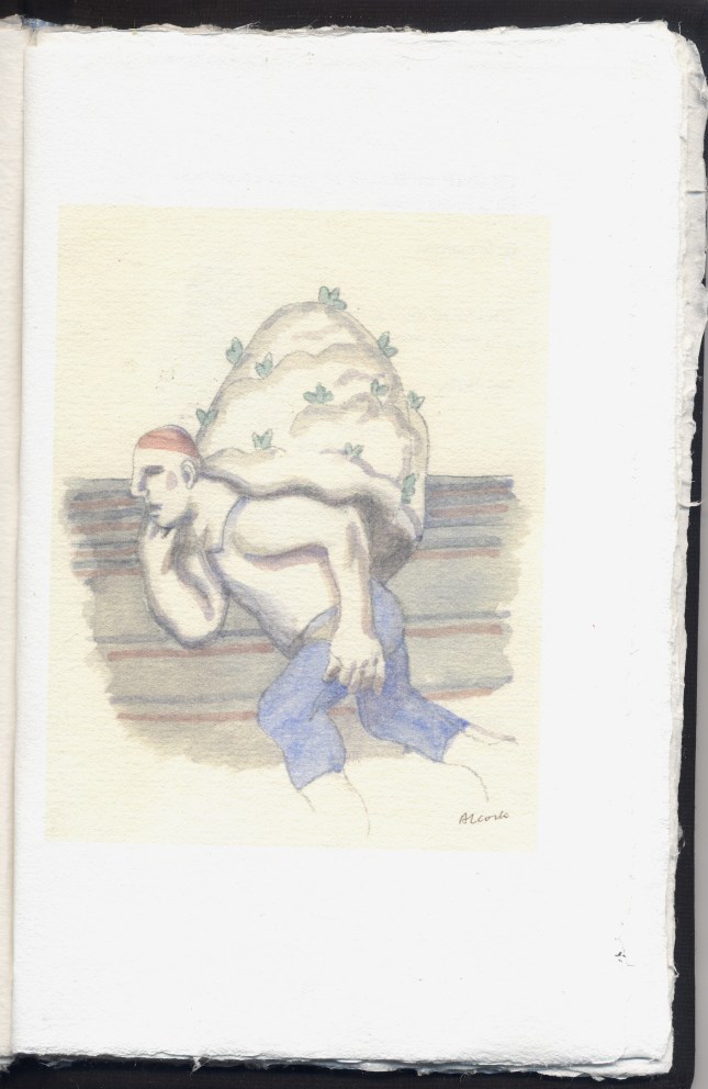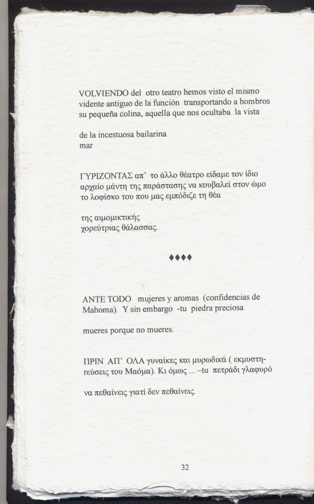*del libro VENTANA AL MEDIODÍA de Sarantis Antíocos que acaba de salir de Segundo Santos EDICIONES, en edición bilingue de bibliofilia, impreso sobre papel artesano de lino y algodón, libre de ácido y con 15 dibujos originales de Don Manuel Alcorlo. Diseño del gran maestro de bibliofilia y de papel artesano Segundo Santos.