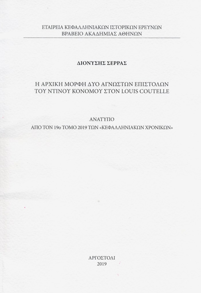 Ο φίλος ποιητής και μελετητής Διονύσης Σέρρας μας έστειλε σε ανάτυπο τη νέα εργασία του, που δημοσιεύθηκε στα “Κεφαλληνιακά Χρονικά”. Τον ευχαριστούμε θερμά. Πρόκειται για την παρουσίαση και τον σχολιασμό δύο άγνωστων επιστολών, σε αρχική μορφή, του αείμνηστου ζακυνθινού ιστοριοδίφη και λογοτέχνη Ντίνου Κονόμου (1918-1990), προς τον φίλο του Γάλλο σολωμιστή Louis Coutelle (1921-2012). Δεδομένου ότι οι ταχυδρομημένες επιστολές του Κονόμου στον Coutelle λανθάνουν, τα δύο αυτά πρωτόγραφα έχουν ιδιαίτερη σπουδαιότητα διότι τεκμηριώνουν – και από την πλευρά του Κονόμου – την θερμή σχέση φιλίας και αλληλοεκτίμησης μεταξύ των δύο αλληλογράφων. Έχει προηγηθεί η παρουσίαση από τον Σέρρα τεσσάρων επιστολών του Coutelle στον Κονόμο – και πάλι από τα “Κεφαλληνιακά Χρονικά” (17, 2016).