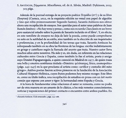 Κριτική του ελληνιστή José R. Del Canto Nieto για το νεο βιβλίο του Σαράντη Αντίοχου ΣΥΜΜΙΚΤΑ / MISCELLANEA, που εκδόθηκε στη Μαδρίτη από τις εκδόσεις Dykinson, στη σειρά Dykinson Clasicos.