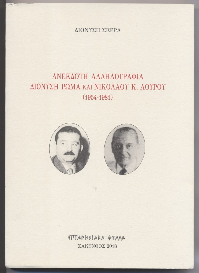 * Ο φίλος ζακυνθινός ποιητής Διονύσης Σέρρας είχε την ευγενική καλωσύνη να μας στείλει το νέο του βιβλίο, με τίτλο ΑΝΕΚΔΟΤΗ ΑΛΛΗΛΟΓΡΑΦΙΑ ΔΙΟΝΥΣΗ ΡΩΜΑ ΚΑΙ ΝΙΚΟΛΑΟΥ Κ. ΛΟΥΡΟΥ (1954-1981), που κυκλοφόρησε πρόσφατα από τις εκδόσεις ΕΠΤΑΝΗΣΙΑΚΑ ΦΥΛΛΑ. Πρόκειται για μια συλλογή επιστολών που αντάλλαξαν στην προειρημένη περίοδο δύο φίλοι, κορυφαίοι διανοούμενοι: ο Ζακυνθινός συγγραφέας κόντες Διονύσης Ρώμας (1906-1981), διακεκριμένος γόνος της ιστορικής οικογένειας της Ζακύνθου, και ο σπουδαίος επιστήμονας, συγγραφέας και ακαδημαϊκός Νικόλαος Κ. Λούρος (1898-1986). Συνολικά δημοσιεύονται 32 σωζόμενες επιστολές , (16 ανά αλληλογράφο), με επιμέλεια, εισαγωγή και λεπτομερή υπομνηματισμό και σχολιασμό του Διονύση Σέρρα. Το περιεχόμενο των επιστολών είναι πολυθεματικό και μας προσφέρει πολύτιμα στοιχεία για την προσωπικότητα, τα ενδιαφέροντα, τις αγωνίες και γενικά το πνευματικό σύμπαν των δύο αλληλογράφων. Εκφράζοντας τα συγχαρητήριά μας στον Διονύση Σέρρα για την προσφορά του αυτή στην ζακυνθινή επιστολογραφία, θέμα που μας συγκινεί περισσότερο, ευχόμαστε να του δοθεί η ευκαιρία να συγκεντρώσει και να εκδώσει ολόκληρο το Επιστολάριο του Διονύση Ρώμα, ει δυνατόν κατά το πρότυπο εκείνου του Ούγου Φώσκολου που έχει εκδοθεί από τον Οίκο Le Monnier της Φλωρεντίας.