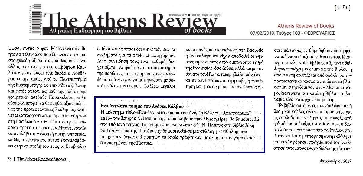 Με χαρά πληροφορηθήκαμε από τον εκλεκτό φίλο καλβιστή κ. Σπύρο Ν. Παππά την προσεχή δημοσίευση στο ATHENS REVIEW, ενός άγνωστου ποιήματος του Ανδρέα Κάλβου, που ο ίδιος ανακάλυψε στη βιβλιοθήκη Forteguerriana. Κοινοποιούμε την ανακοίνωση του περιοδικού με ημερομηνία 7 Φεβρουρίου 2019 και θα επανέλθουμε όταν δημοσιευθεί η εργασία της παρουσίασης και του σχολιασμού του ποιήματος. Για άλλη μια φορά από το παρόν ιστολόγιο εκφράζουμε τα θερμά συγχαρητήριά μας στον κ. Παππά για την συνεχιζόμενη πολύτιμη προσφορά του στις καλβικές μελέτες.