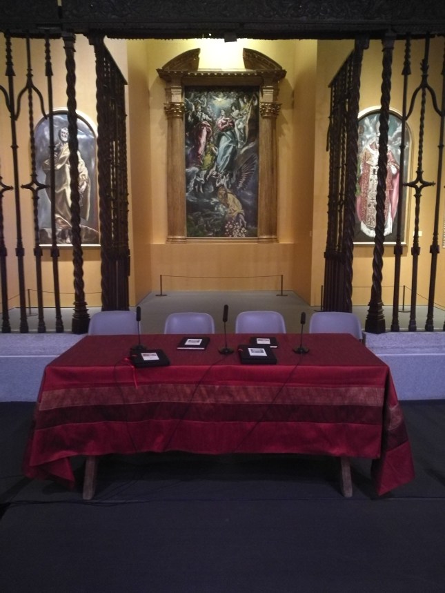 *Fotos del acto de la presentación del libro de Sarantis Antiocos VENTANA AL MEDIODÍA, ayer, en el célebre Museo de Santa Cruz, de Toledo, delante de una decena de joyas de Dominikos Theotokopoulos, El Greco.
