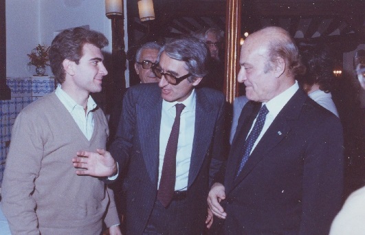 Ο Σαράντης Αντίοχος συστήνει στον Οδυσσέα Ελύτη τον νεαρό Ισπανό ποιητή Cesar Antonio Molina, στη δεξίωση που δόθηκε στη Μαδρίτη προς τιμή του Έλληνα νομπελίστα, κατά την επίσημη επίσκεψή του στην Ισπανία, προσκεκλημένου από την Κυβέρνηση του Adolfo Suarez.