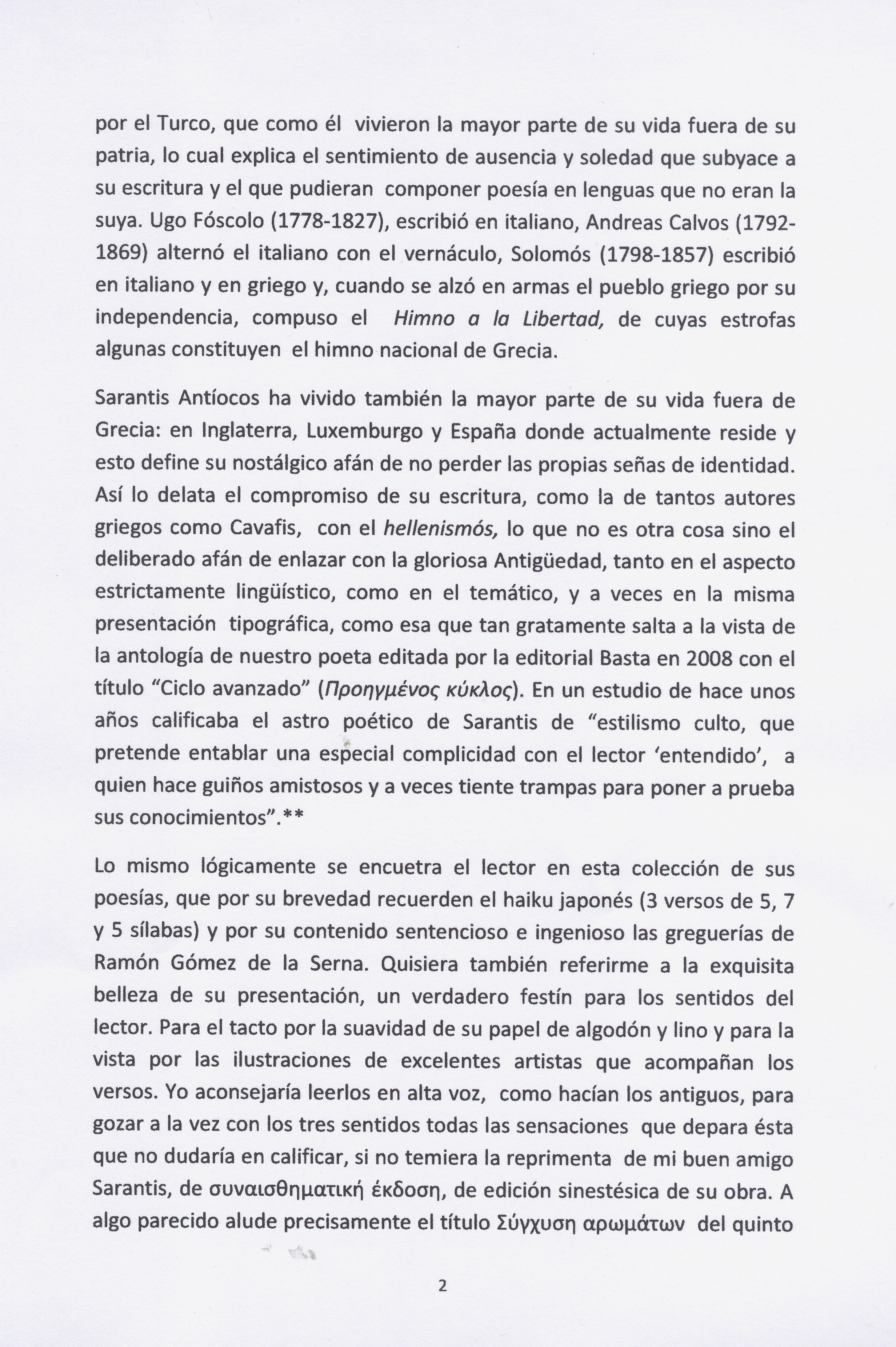 Más de una vez Sarantis Antíocos ha citado las palabras de Juan Ramón Jiménez: “no hay verso y prosa”, porque, como él, sabe lo importante que es romper los márgenes, huir de la rigidez. La poesía va más allá de las palabras, puede ser una sugerencia, un destello, un guiño, un juego. Así son estos poemas, y a la vez son profundos, serios, y están impregnados de una extraña belleza.